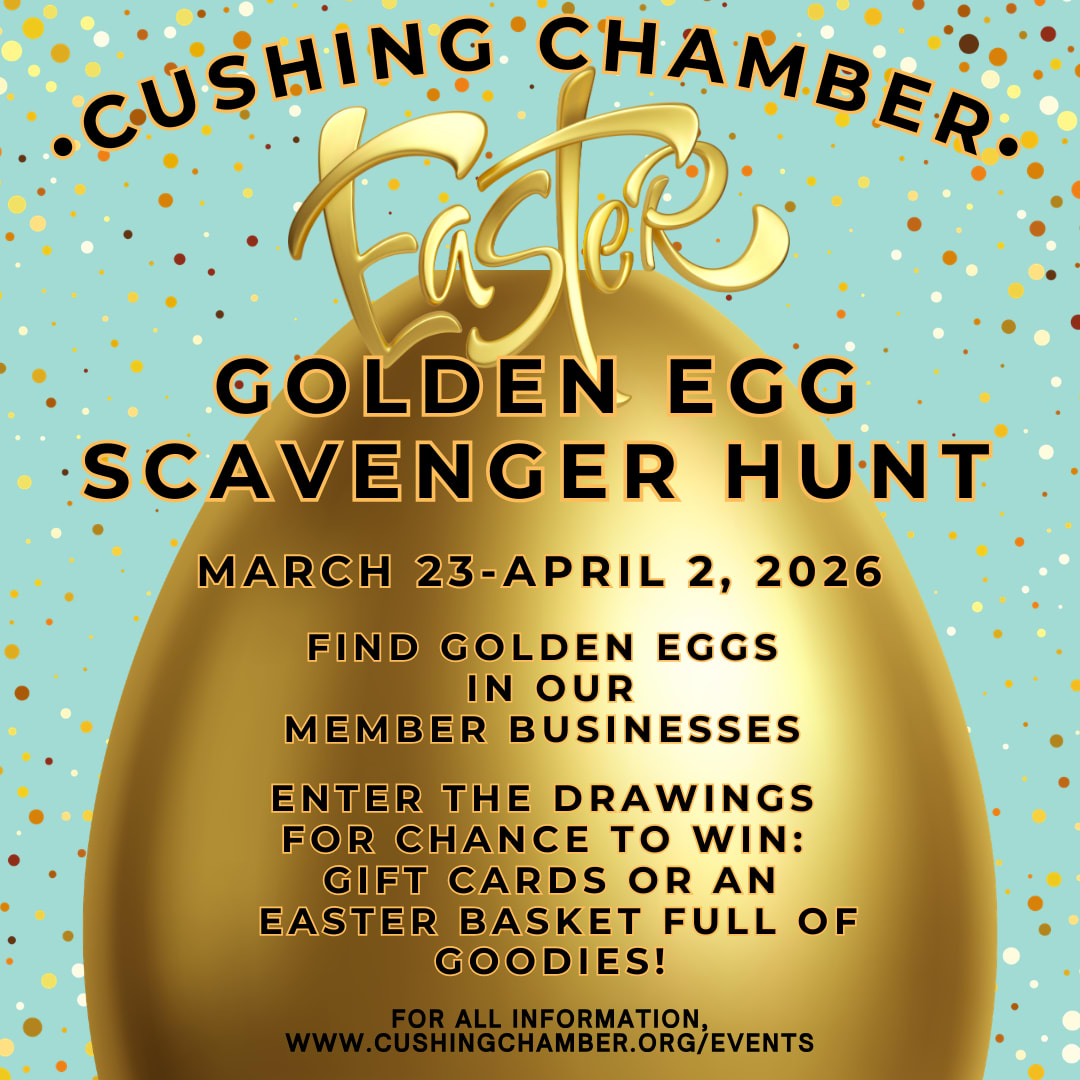 IN LOCAL MEMBER BUSINESSES THROUGHOUT CUSHING, OKDeadline for Member Partners to sign up to participate: March 23, 2026 at NOON! Chamber Staff will deliver entry forms, Golden Egg, and Easter Basket for entry forms the afternoon of March 23 if not before.