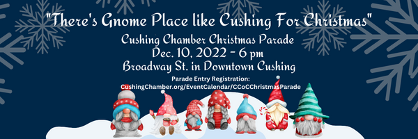 VOLUNTEER CHRISTMAS ELVES & GNOMES FROM THE NORTH POLE NEEDED TO HELP HAND OUT CANDY BAGS 5 PM - 6 PM! Call the Cushing Chamber office at 918-225-2400 to sign yourself and/or your group to volunteer! This is an amazing opportunity to interact and have some fun with the public, waiting for the parade to start! Wear your businesses' logo shirts or Church Group shirts!