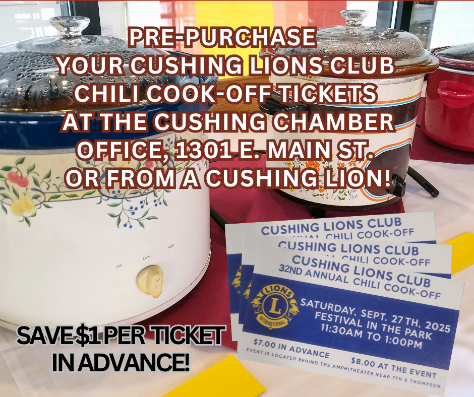 Join us for our Annual Chili Cook-Off! Taster kits will be sold to the public during the Cushing Chamber 37th Annual Festival in the Park and the public will taste test all contestant's chili entries. There will be a People's Choice and Secret Judge's Choice.