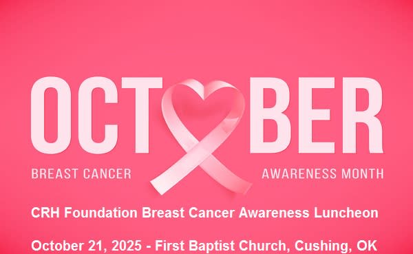 🎀 The Cushing Regional Hospital Foundation is hosting the 2025 Breast Cancer Awareness Luncheon & Silent Auction on October 21st at the First Baptist Church in Cushing. All proceeds help provide breast cancer care for community members who cannot afford treatment, as well as travel assistance for appointments.