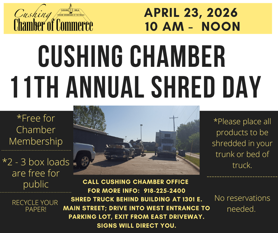 - Call the Cushing Chamber Office for more info: 918-225-2400