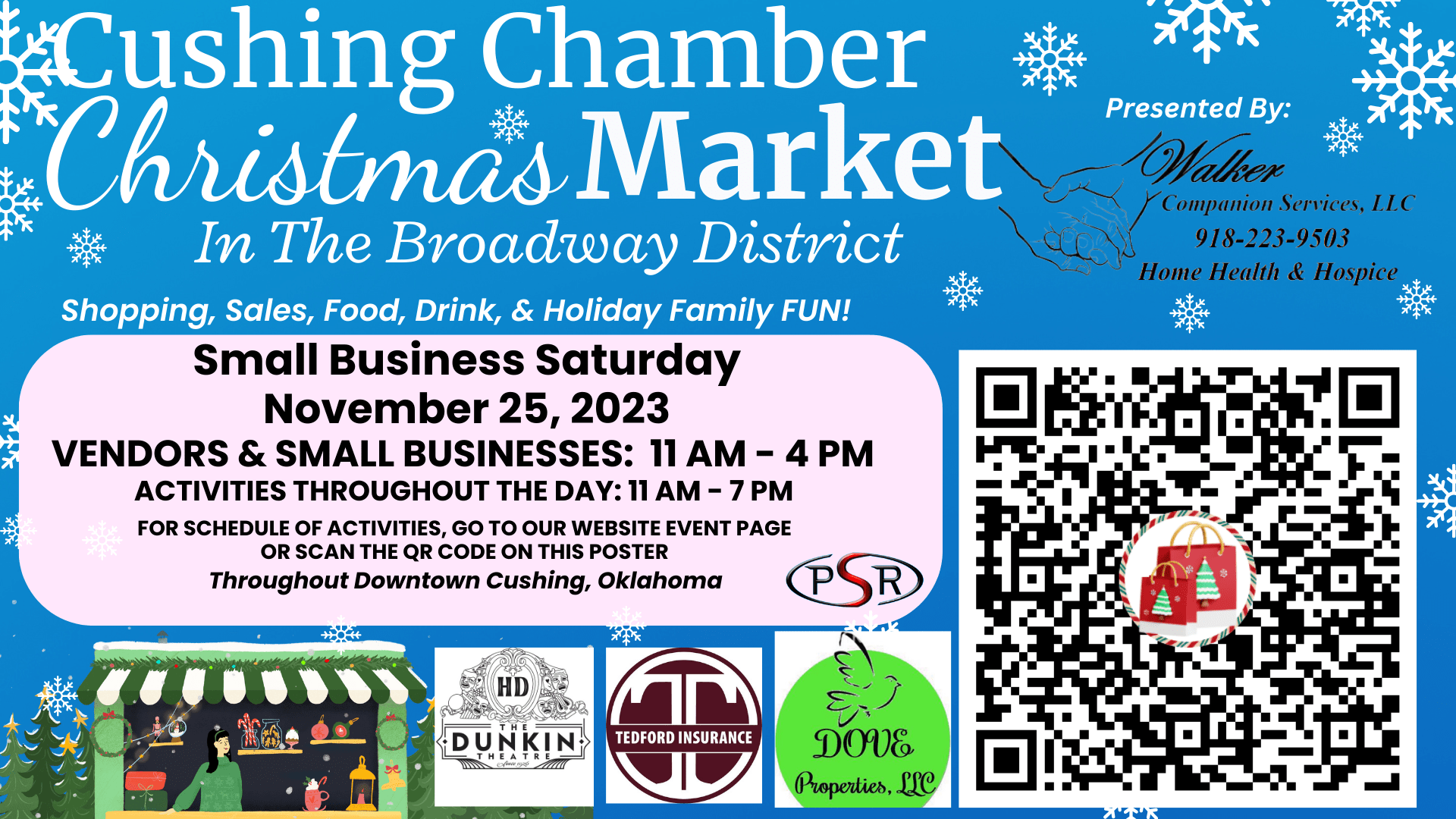 *****PLEASE NOTE: This event is a RAIN OR SHINE EVENT; the event will continue regardless of weather. Vendors are welcome to leave, but the event will continue throughout the day. No refunds will be given after Nov. 22 at Noon. The Cushing Chamber office will be closing early on Wednesday, Nov. 22 at Noon and will be closed Thursday, Nov. 23 & Friday, Nov. 24 for the Thanksgiving Holiday. If you need to contact us, please private message our Facebook page or text 918-629-7045. Thank you and we look forward to seeing you all Saturday, Nov. 25!