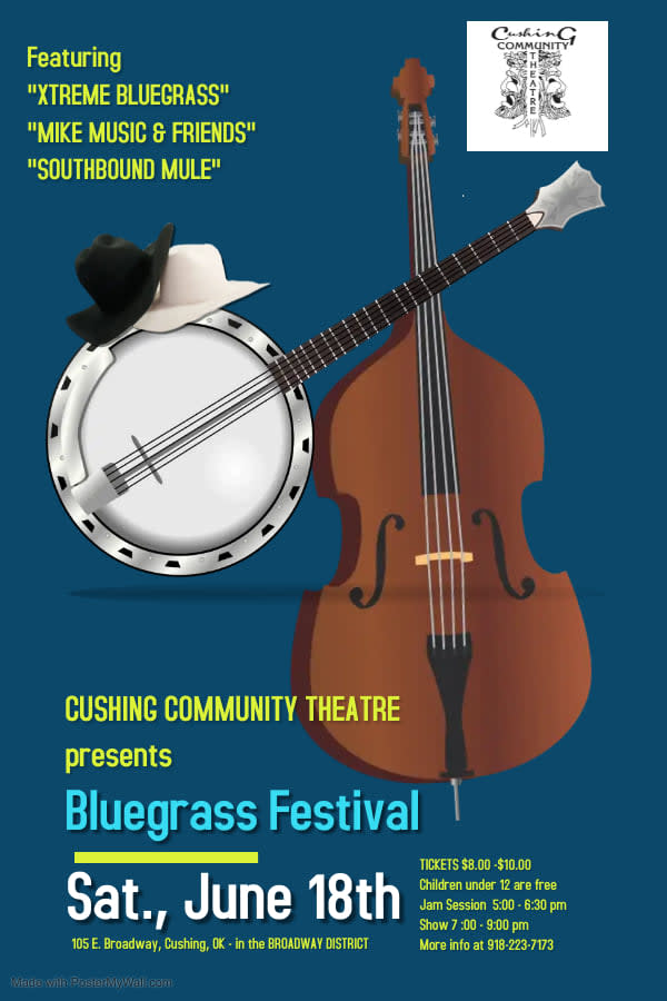 Musicians with paid ticket encouraged to join the Jam Session at 5:00 pm in Centennial Park. Bluegrass Show featuring "Xtreme Bluegrass" - "Mike Music & Friends" - "Southbound Mule" will begin at 7:00 pm at the Cushing Community Theatre.