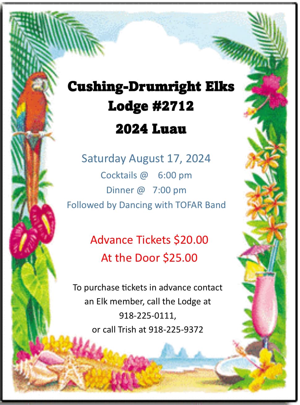 To purchase tickets in advance contact an Elk Member, Call the Lodge at 918-225-0111 or call Trish at 918-225-9372