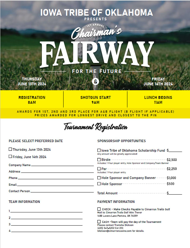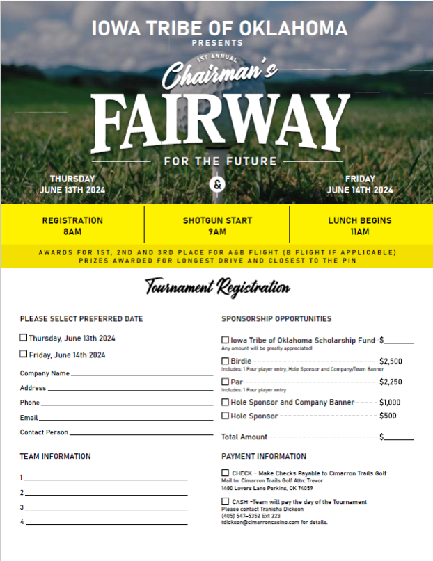 If paying with cash, please pay on the day of the Tournament. Contact Tranisha Dickson at 405.547.5352 Ext 223 or email her at tdickson@cimarroncasino.com.