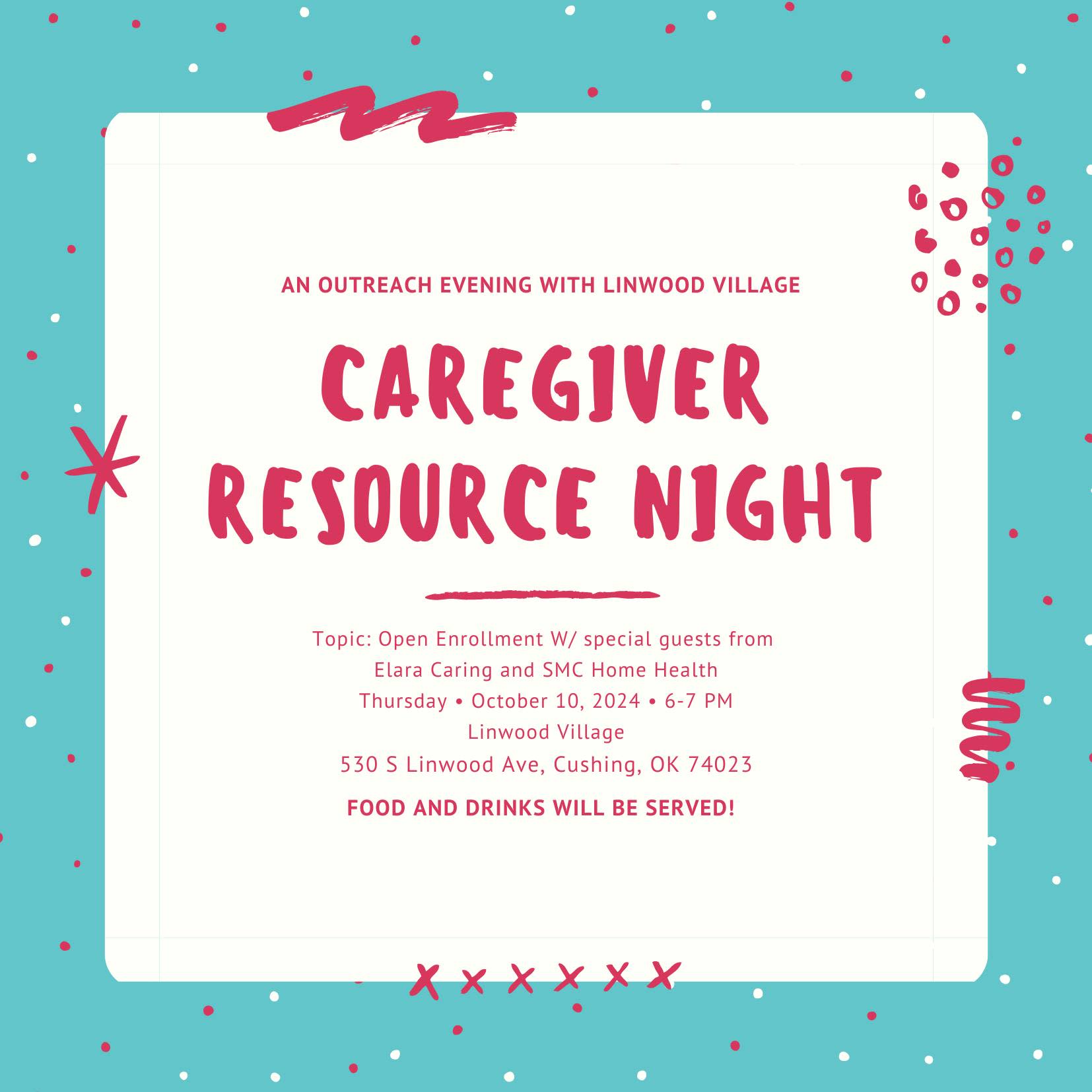 Join us next Thursday for Caregiver Resource Night. This event is open to the public. We will be discussing Open Enrollment for Medicare and Private Insurance Plans and have special guests from Elara Caring and Stillwater Medical Home Health. Please RSVP to Cara or Sam by 10/8, (918) 225-2220.