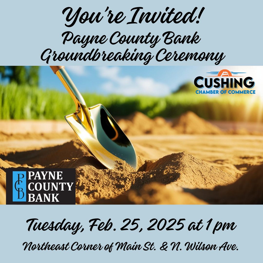 Join us for the Payne County Bank Groundbreaking ceremony and welcome them to Cushing! We are so excited to welcome Payne County Bank's new location in Cushing. Their original location is in Perkins and they are growing!