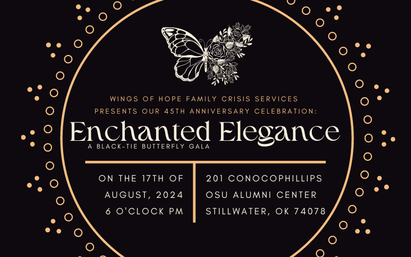 In celebration of its 45th anniversary, Wings of Hope Family Crisis Services is proud to present the "Enchanted Elegance: A Black Tie Butterfly Gala." This event will take place on August 17th at the OSU ConocoPhillips Alumni Center, promising an evening filled with hope, glamor and whimsy.