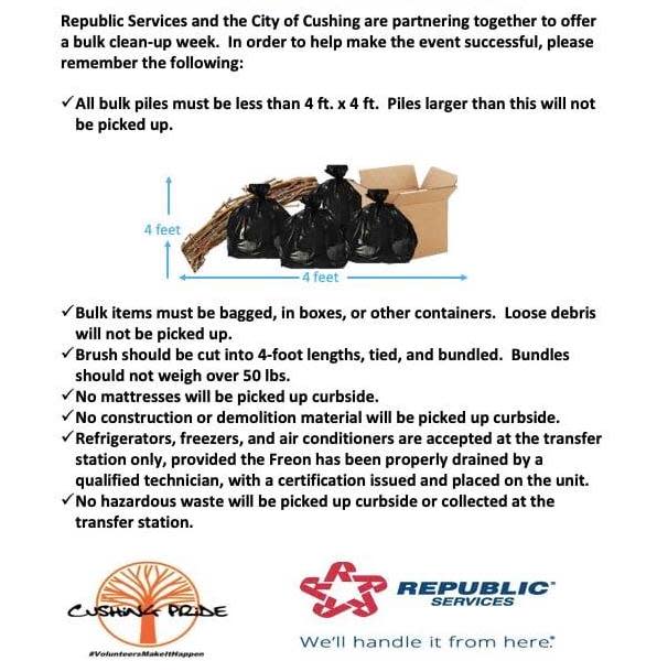 - REPUBLIC SERVICES & CITY OF CUSHING Are partnering together to offer a bulk clean-up week. In order to help make the event successful, please remember the following: