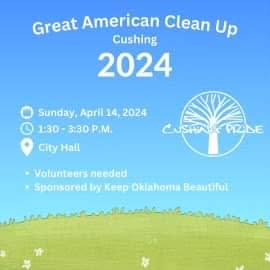 Meet at City of Cushing City Hall at 1:30 pm on Sunday, April 14 to get your supplies and get placed in your spot to clean up in Cushing, OK!