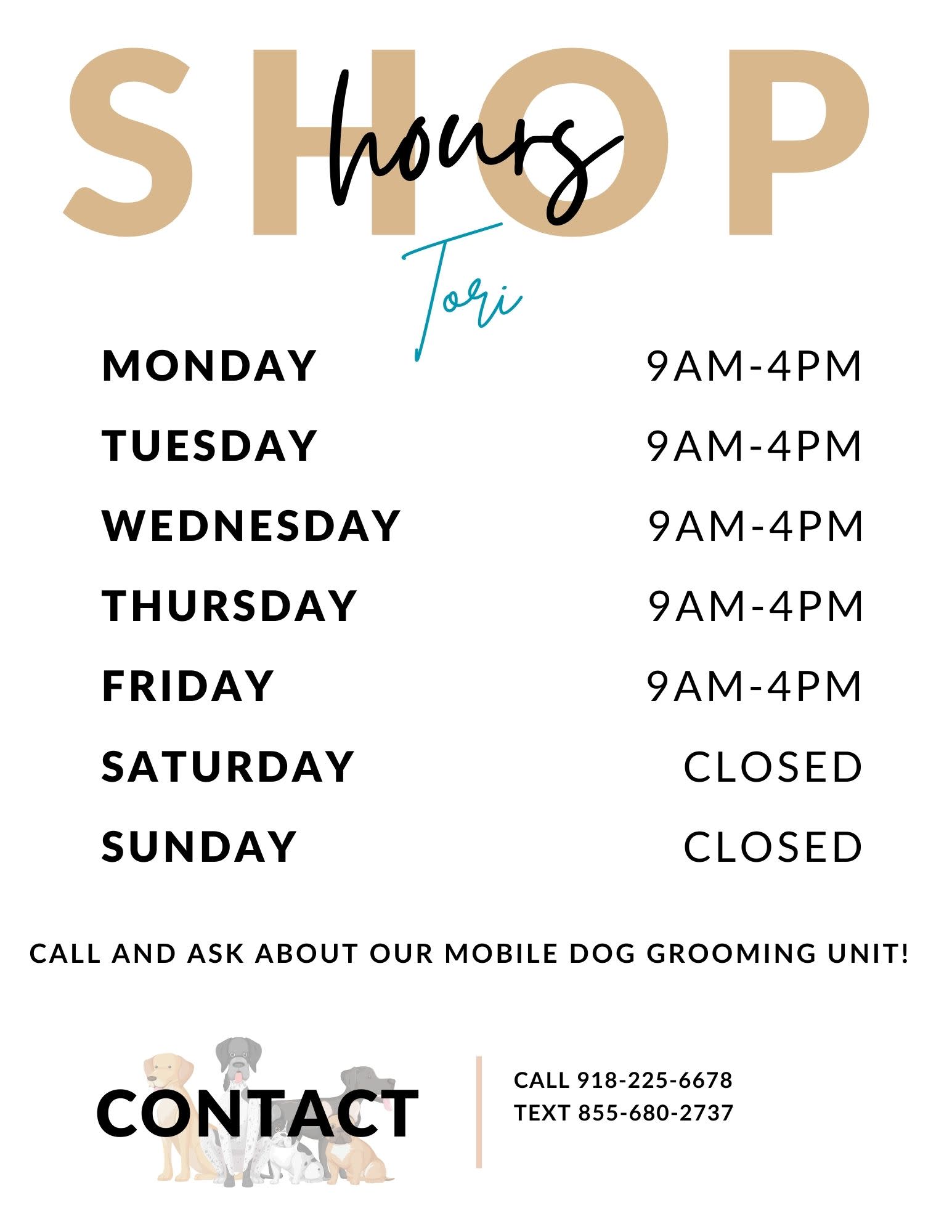 OR, GIVE US A CALL OR SEND US A TEXT TO SCHEDULE AN APPOINTMENT IN OUR SHOP OR ON THE MOBILE GROOMING BUS: