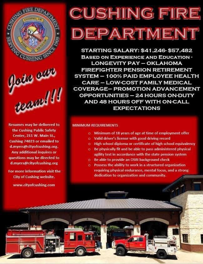 To apply - send your resume to d.myers@cityofcushing.org or apply in person at the Cushing Public Safety Center - 211 W. Main Cushing, OK 74023