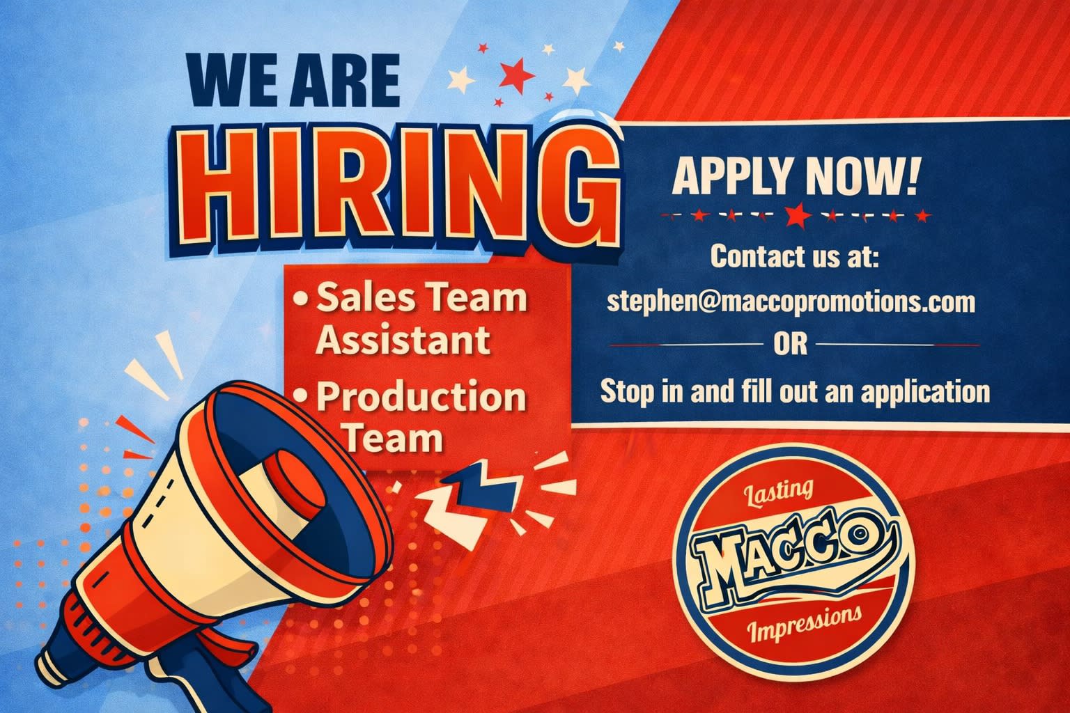 Macco Promotions is looking to hire a Sales Team Assistant and a Production Team Associate. Click to read more!