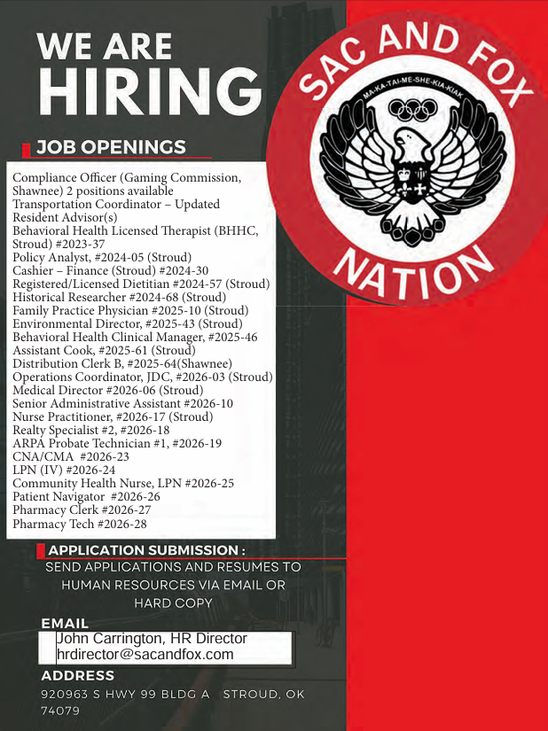 Sac and Fox Nation is hiring multiple positions! Click to read more!
