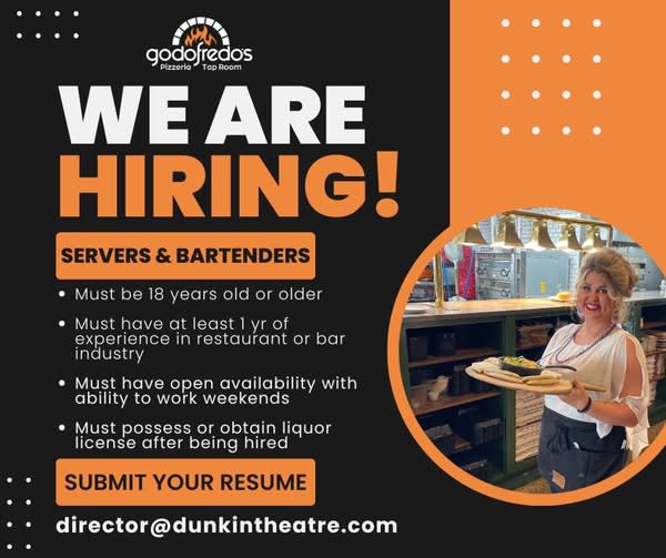If you're passionate about hospitality and want to be part of a fun, hardworking team, email your resume to director@dunkintheatre.com.
